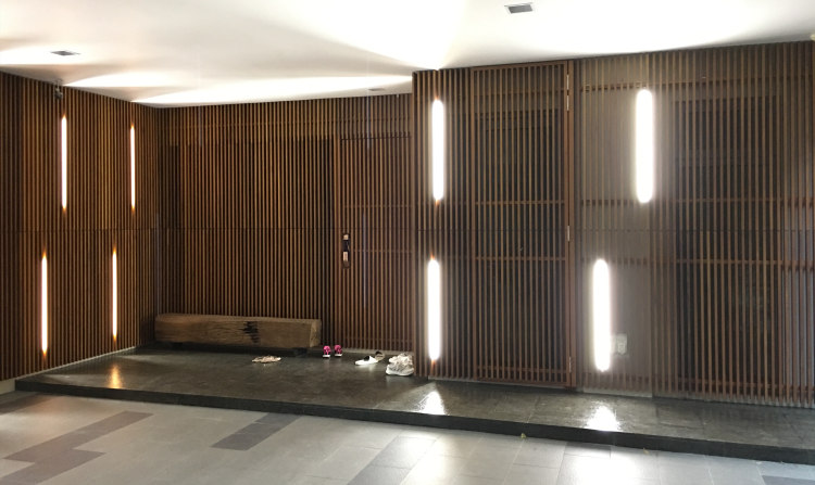 8-柚木木栅格门扇做门档-柚木实木门在后